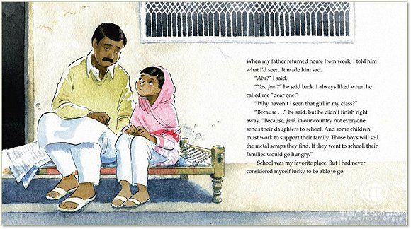 看著上面這張由法國藝術家duo Kerascoët創作的插畫,馬拉拉回憶道:“這張照片讓我想起一家人一起看電視的情景。我的弟弟們總是坐在地上,而我充滿了好奇。那時候的斯瓦特縣平和而安寧,是我生命中最為懷念的時光。”