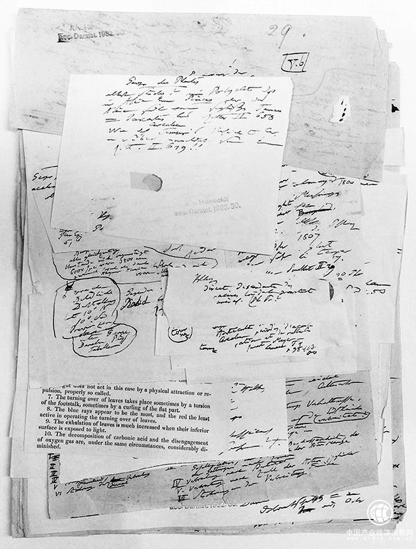 結束了歷時5年的拉丁美洲探險之后,洪堡于1804年5月登陸美國,受到時任美國總統托馬斯·杰斐遜的盛情款待,并為他們帶去關于西班牙殖民地(當時大部分地區都不向美國開放)的信息。之后,洪堡回到巴黎。他回顧見聞,記錄并公開演講自己的探險之旅。他不眠不休,但手寫速度還是趕不上大腦的運轉:他會在手稿頁邊的空白部分,密密麻麻地記錄關于下一章節或者另一篇論文的新點子。實在寫不下時,他就直接把想法刻寫在木頭桌子上。