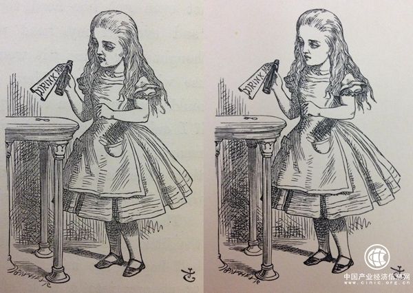 《愛麗絲漫游奇境》美國阿普頓版(左)與一八六六版對比