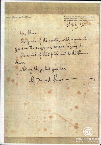 蕭伯納在給黃佐臨的題詞手稿上寫道:“起來,中國:東方世界的未來是你們的”