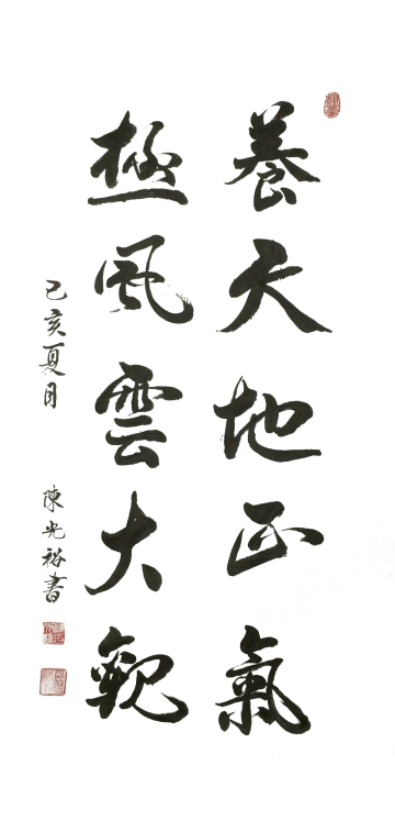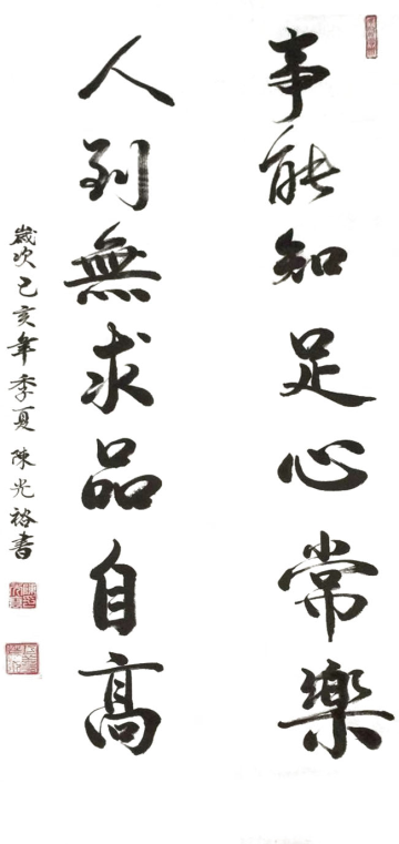 陳光裕,民族(漢),姓別(男),出生1963年5月,廣東教育學院教育管理(本科)畢業,現任教于廣東省湛江市麻章中學,職稱:中學高級語文教師。本人從小便喜歡中國傳統文化毛筆書法,幾十年來,憑借個人的愛好,專心自學毛筆書法,每年春節前夕,為了方便、滿足群眾帖春聯的需求,從農歷十二月二十一至二十九(除夕),都堅持在集市為群眾寫春聯,所寫春聯深受廣大市民的喜歡和稱贊。近年來,也曾多次參與區委宣傳部、區文聯開展春節送春聯下鄉活動。2018年4月,毛筆書法作品入選中國藝術大賽網舉辦的"中國第三屆書畫大賽"并獲得"優秀作品獎";2018年8月,毛筆書法作品參與語文報社、語文報書法版編輯部舉辦的"全國第三屆全國中小學書法教學聯盟,"三筆書"書法作品評選中榮獲三等獎。從2000年至今十九年來,為了提高自己的書法寫作水平,一直在探索書法理論的同時,認真細讀歷代書法名家名作、名帖,并堅持每天臨帖學習。如:王羲之的《蘭亭序》、趙孟頫的《膽巴碑》、《洛神賦》等,也曾師從本地徐仲南、陳從信、陳成茂,彭耕、陳光海等書法家。近幾年多次參加區教育系統以及區委宣傳部、區文聯舉辦的傳承傳統文化等書法比賽,并多次榮獲優秀作品獎。