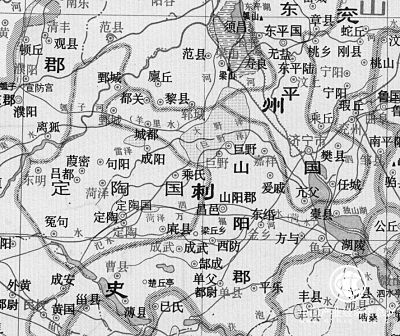 在戰國時,陶曾一度成為“天下之中”,因而,經由函谷關而東西方向橫亙的交通大干道,必然要從洛陽向東延伸途經大梁而抵達于陶。過了陶,再向東稍行,就是后來昌邑國的首縣昌邑縣。而若是由此昌邑進一步向東,受魯中山地高低起伏變化的影響,道路已經無法像平地一樣通暢了。這條東西向大干道,在經過西漢昌邑縣治所之后,與一條略近于南北向的大干道相連接。這條干道,南端來自彭城方向,大致循泗水、菏水水道西北行,在西漢昌邑縣東側不遠的地方,轉而北上,經巨野澤東側,再向北,則抵達黃河下游的重要津渡——平原津。