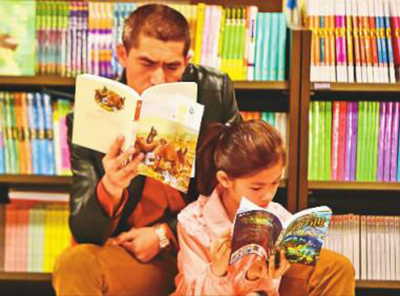 山東煙臺南大街購書中心,一對父女正在閱讀經典書籍。初陽攝光明圖片/視覺中國
