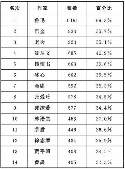 與“魯郭茅巴老曹”的排序相比,魯迅依然高居榜首,巴金、老舍的排名略有提升,郭沫若落到了第9位,茅盾、曹禺則分列第11位、第14位。