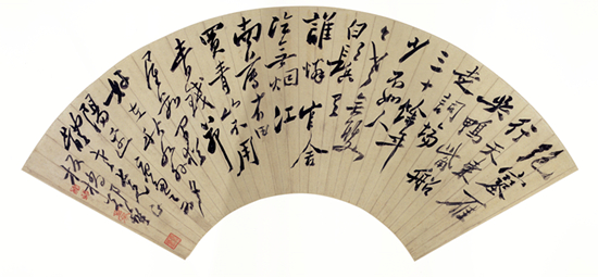 鄭燮《行書自作唐多令詞扇》。釋文:絕塞雁行天,東吳鴨嘴船,走詞場三十余年。少不如人今老矣,雙白鬢,有誰憐官舍冷無煙,江南薄有田,買青山不用青錢。茅屋數間猶好在,秋水外,夕陽邊。