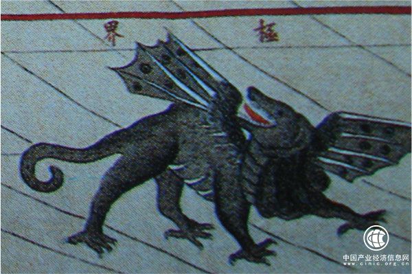 他舉例圖中一只類似于“飛龍”的有翼獸。要知道中外都有具備雙翼的神獸或魔獸。在西方文化中,那種長有鱗甲類似鱷魚的有翼獸多為鼻吐火焰,口吐火舌的惡龍,但中國人對這樣的動物形象是很陌生的。于是到了中國版的《坤輿萬國全圖》,這一動物就變成接近于中國傳統瑞獸“辟邪”。