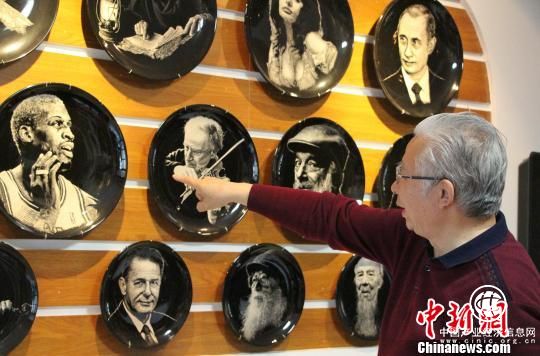 “當、當、當、當”單孟渤一手拿小錘一手拿刻刀,在一個黑釉盤上敲出一道道白色刻痕。他告訴記者,自小喜歡畫畫,有素描基礎,所以嘗試用平刀刻法,模擬素描畫法,用線代替點,刻刀為筆、瓷盤作紙,比傳統尖刀雕刻更快,立體感和層次感更突出。