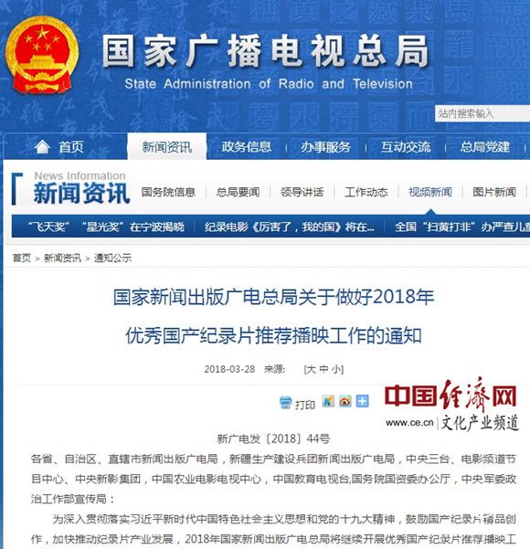 國家新聞出版廣電總局關于做好2018年優秀國產紀錄片推薦播映工作的通知