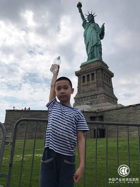 林永健兒子林大竣手拿礦泉水瓶當火炬站在自由女神像前模仿其造型拍照。