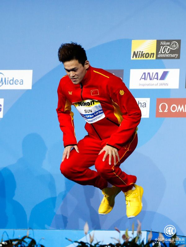 孫楊跳上領獎臺。