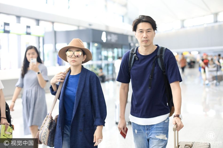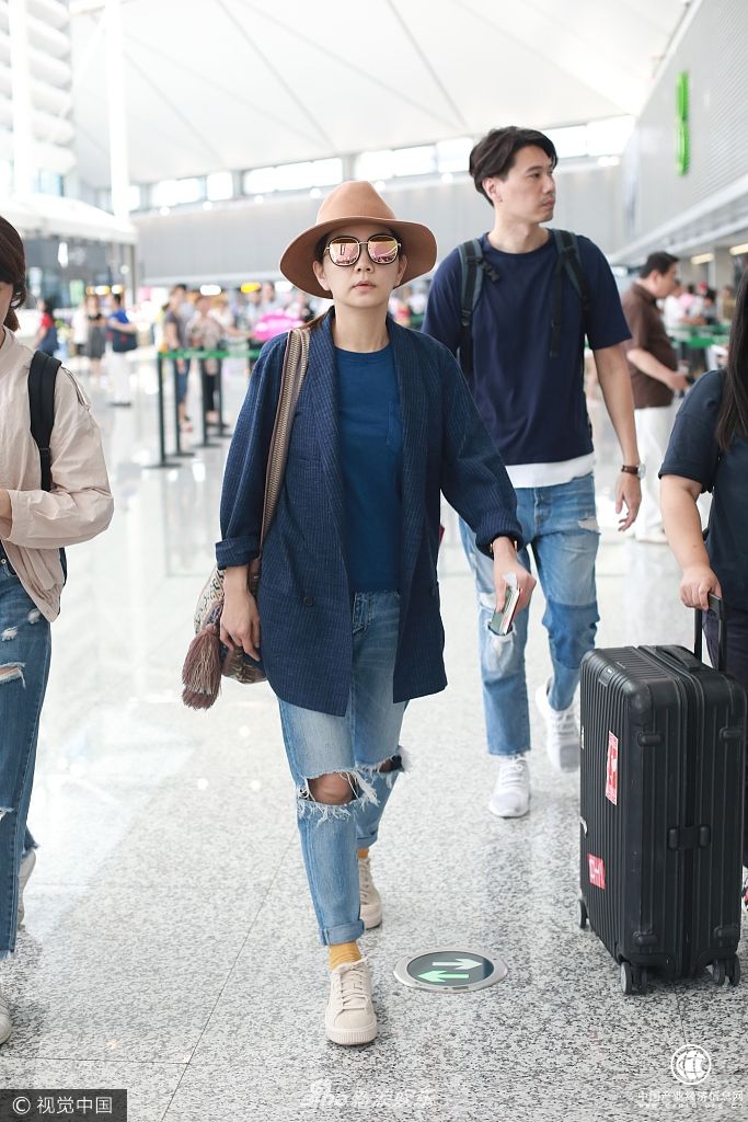 31日,Ella陳嘉樺與老公現身上海機場,Ella身穿藍色西裝破洞褲休閑范十足,老公一邊緊跟保持距離為老婆保駕護航。(視覺中國/圖)