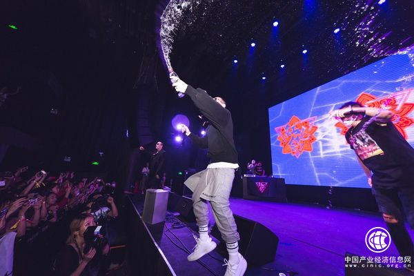 但不妨礙現場的火熱。他們唱了什么一句都聽不清,主要成員的舞步和招牌動作卻聽幾首就記住。殺手锏是手里的礦泉水瓶,隨節奏往臺下一潑一收一扔瓶。據說在另一位因《中國有嘻哈》走紅的紅花會成員PG One的現場,礦泉水瓶也是他的拿手道具。