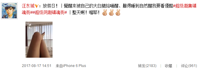 8月17日,汪東城在微博曬出自己的大白腿,還稱:“放假日,一覺醒來被自己的大白腿給嚇醒”。照片中,汪東城躺在床上翹起二郎腿,雙腿又長又白簡直比女生的還好看,看上去狀態舒服愜意。網友們紛紛留言:“腿比女生好看系列”、“好想分點腿毛給他”、“滿分大白腿!”