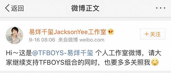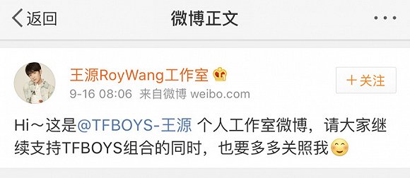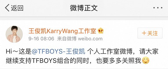 9月16日早上8點06分,TFBOYS組合王俊凱、王源、易烊千璽同時開通個人工作室官微,并各自發文向網友打招呼,三個賬號的微博認證均為“北京時代峰峻TFBOYS組合-(藝人姓名)個人工作室官方微博”。