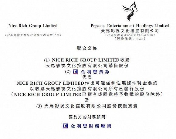停牌僅2天,天馬影視就在昨晚披露,10月22日,開曼公司NICERICHGROUPLIMITED(以下簡稱NRGL公司)作為要約方,與包括黃百鳴在內的賣方、保證人簽訂協議,向賣方收購天馬影視全部已發行股本約58.71%。根據買賣協議,銷售股份的總代價為4.86億港元,相當于每股0.319港元。