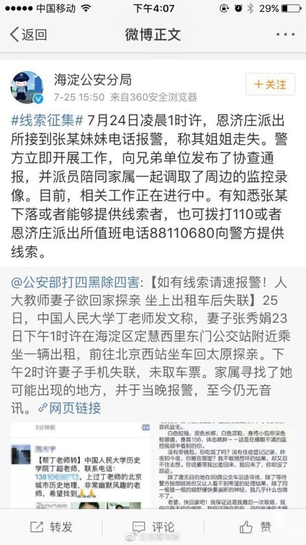 @北京青年報 官方微博7月25日消息,今天(7月25日)上午,中國人民大學歷史學院老師丁超在朋友圈發布了一條尋人啟事,稱自己妻子張秀娟于7月23日(周日)下午1點,本應乘坐89路公交車從北京市海淀區定慧西里去北京西站,但最終未乘公交車,而是乘坐了一輛出租車。從當日下午2時許,家人與張女士失聯至今。家屬稱,張女士在此期間沒有回家,也沒有坐原計劃去太原的火車,手機關機,音訊皆無,家屬已于7月23日晚報警。