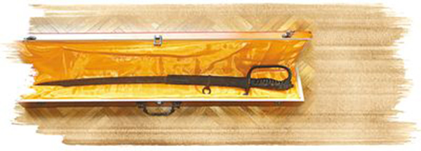 打開像二胡琴盒那樣的一只精美的樟木匣子,紅布裹著的一柄修長的硬物靜靜地臥在橙色的綢緞中;再一層層掀開紅布,一把兩指寬,近一米長的指揮刀,驀然出現在眾人眼前。刀呈弧形,作為刀的部分從由銅條環護的龍頭刀柄處伸出,長長的像一條帶魚那樣微微翹起來。刀身是黑的,不是人為涂上去的黑,而是被漸漸生長出來的銹覆蓋了原有的光芒。換個角度說,那斑斑銹跡,是南方慢慢的,年復一年,日復一日,在刀身和刀刃上凝固的漫長、潮濕而又沉寂的時間。