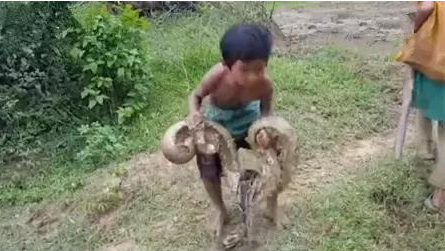 據外國媒體報道,柬埔寨一對姐弟以捕蛇為生,瘦小的弟弟趴在地上,引來巨蟒纏住他,等在一旁的姐姐立刻上前把蟒蛇拽開,弟弟同時連蹬帶踹把“蛇褲子”甩下去,姐弟倆在整個過程中神色自若,成功將巨蟒捕獲,手法相當熟練。