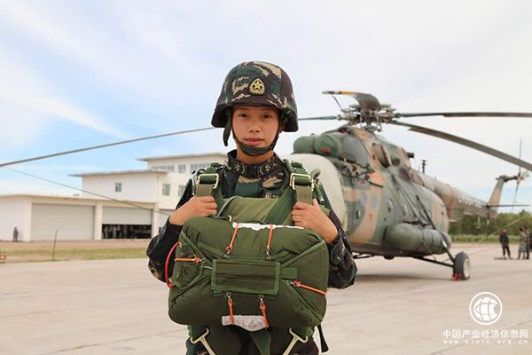 即將登機傘降的郭鑫,巨大沉重的傘降裝具和保護頭盔使這個姑娘的身形顯得更小了。