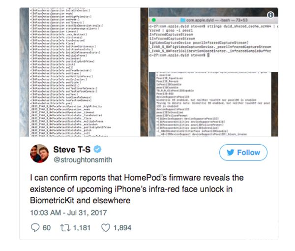 除此之外,固件代碼還泄露了iPhone 8正面會使用紅外線傳感器來拍攝人物臉部,而不是通過傳統相機的可視光。