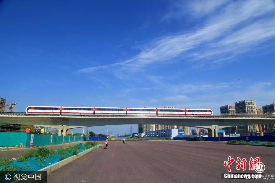 8月5日,北京,磁浮列車在軌測試。北京磁懸浮示范線,又稱北京地鐵S1線,目前正在軌道測試運行。S1線是北京首條磁懸浮線路,一期工程全長10公里,起點為北京石景山區的蘋果園站,終點為門頭溝區的石廠站。李長山 攝 圖片來源:視覺中國