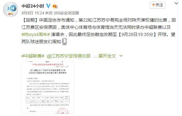 8月8日,據中國足協職業聯賽理事會公布,江蘇蘇寧主場的中超第22輪比賽延期。理由是南京奧體中心在本周末將承辦TFBOYS的演唱會,比賽被推遲到了九月底。