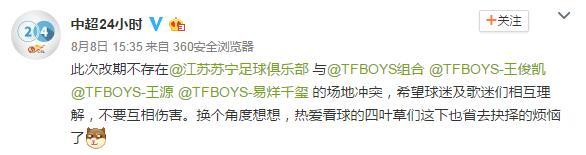 中超第20輪結束后,就開始傳出了江蘇蘇寧下一個主場要延期的風聲,因為TFBOYS將于同一個周末在南京奧體中心體育館舉行演唱會。