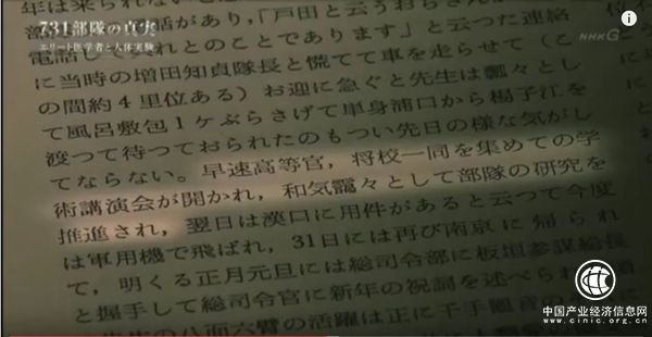 解說員:“731部隊”實施實驗的(地點),是位于中國東北部舊滿洲的秘密研究所。活生生地被當成試驗材料而死去的人,據說達到了3000人以上。為何人體試驗會被推進到如此規模?NHK電視臺從國內外收集到了數百件資料。浮出水面的,不僅是日本軍人,還有從東京大學、京都大學等調集而來的“精英醫學者”,(他們)也主導著人體試驗這一實際事態。