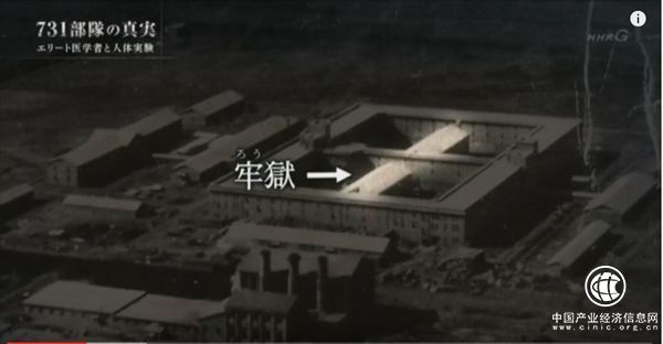 解說員:這是(“731部隊”總部)當時的照片。部隊在方圓數公里的廣闊營地中,極其秘密地實施著研究。在四方形的三層大樓里,并排著的是裝備有制冷制暖設備的最先進的研究室。大樓中央設置有從周圍無法看見的牢獄,用來關押被用作試驗材料的人們。