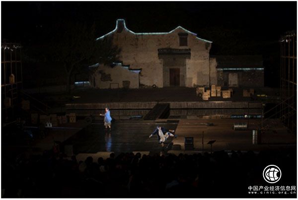 水劇場,位于西柵景區的西南角,舞臺架設在水池中,2300多個由原木鋪就的觀眾席呈扇形展開,逐層升高,蔥郁的樹木間隔在通道和四周。居高臨下,湖泊中近七千平方米新月形的主舞臺盡收眼底。舞臺背后連綿的明清老建筑群,馬頭墻、觀音兜,高聳的白蓮古塔和飛檐翹角的文昌閣勾勒出躍動的天際線。導演孟京輝是當年烏鎮戲劇節的藝術總監,他表示之前也沒有用過這樣的場地,演出效果是出乎意料的好。奇妙效果的背后是烏鎮對戲劇節的巨大投入,單單烏鎮大劇院的建設就投入近4.5億元。