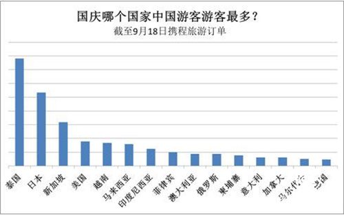 “今年8天長假,攜程旅游客戶將到達全球近100個國家,每天都將有幾千個攜程旅游團在各大洲。”攜程報告預計國慶中秋假期出境游規模將超過600萬人次。從截至18日的跟團游、自由行訂單統計看,國慶游客中,有50%選擇的是出境游產品。我國游客最青睞的前十個國家是:泰國、日本、新加坡、美國、越南、馬來西亞、印度尼西亞、菲律賓、澳大利亞、俄羅斯。東南亞將成為中國超級黃金周的最大贏家,中國赴韓國旅游降幅最大,預計同比降下降七成左右,國慶赴韓旅游團全面中斷。