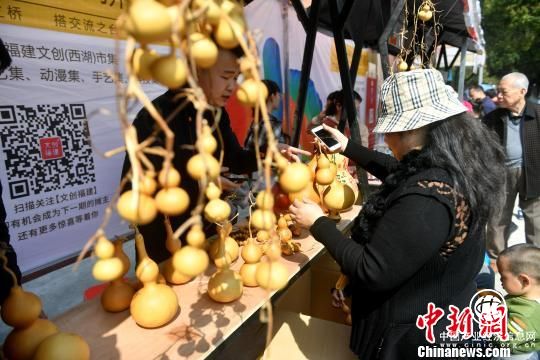 記者在市集“‘淘客’眾創空間”展區看到,大小不同、形狀各異的葫蘆深受喜愛,游客直呼“好看”。福建藝術職業學院服裝設計系大三學生林偉平告訴記者,這些葫蘆都是同學家自己種的。他們將其以針雕、燙畫等方式進行創作,制作成手工制品。
