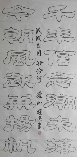 凌躍進,男,愛好詩、書、聯、畫,尤其是書法。獨忠隸書,走向社會后,在農閑和打工閑空時,苦練雙勾隸書,榕多家隸書之精髓,創雙勾獨自成一幟--豆葉雙勾隸書。