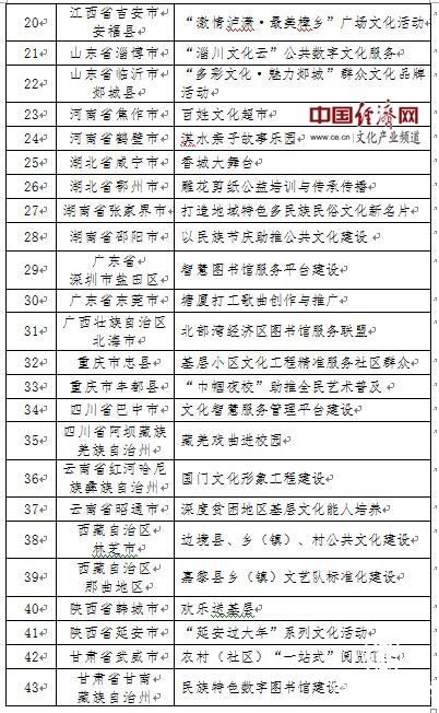 記者了解,2017年8月10日,原文化部、財政部印發了《關于開展第四批國家公共文化服務體系示范區(項目)創建工作的通知》,啟動了第四批國家公共文化服務體系示范區(項目)創建工作。經過各地申報、專家集中評審、公示等環節,產生了此次第四批國家公共文化服務體系示范區(項目)創建資格名單。