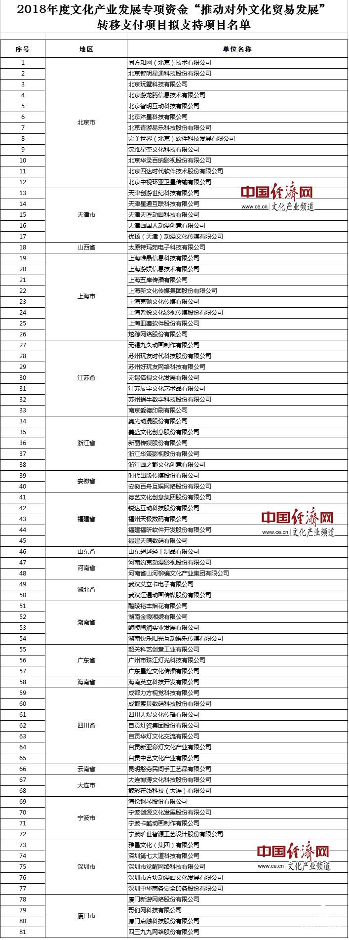 以下是2018年度文化產業發展專項資金“推動對外文化貿易發展”轉移支付項目擬支持項目名單: