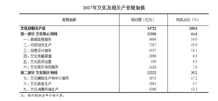 經核算,2017年全國文化及相關產業增加值為34722億元,占GDP的比重為4.2%,比上年提高0.06個百分點;按現價計算(下同),比上年增長12.8%,比同期GDP名義增速高1.6個百分點。2017年文化及相關產業增加值保持平穩快速增長,占GDP比重穩步上升,在加快新舊動能轉換、推動經濟高質量發展中發揮了積極作用。