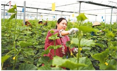 在河南新蔡縣磚店鎮,村民在產業扶貧基地黃瓜溫棚里勞動。宋超喜攝(新華社發)
