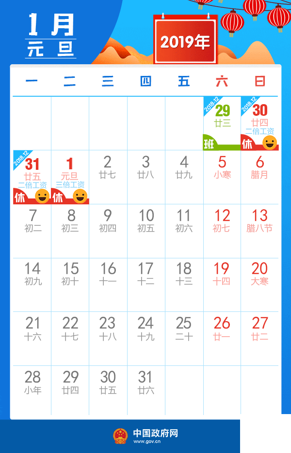 一、元旦:2018年12月30日至2019年1月1日放假調休,共3天。2018年12月29日(星期六)上班。