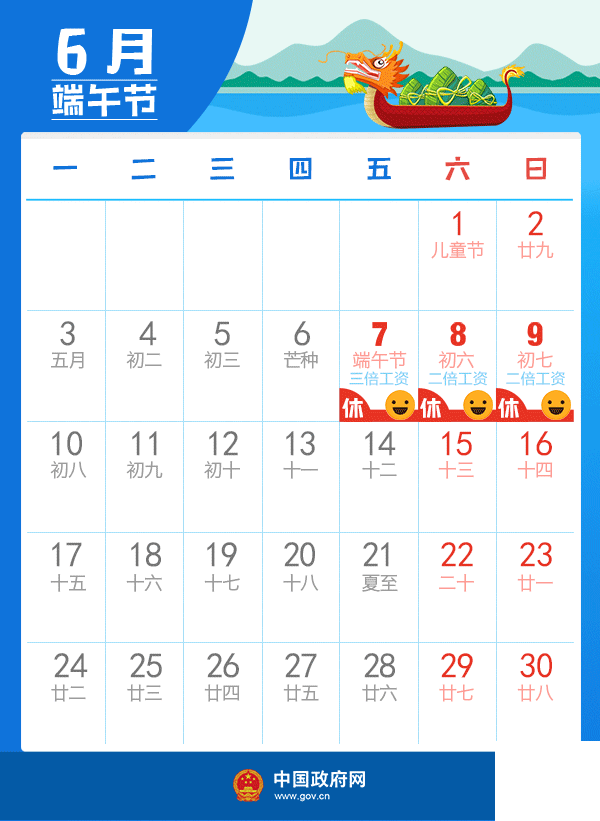 五、端午節:6月7日放假,與周末連休。