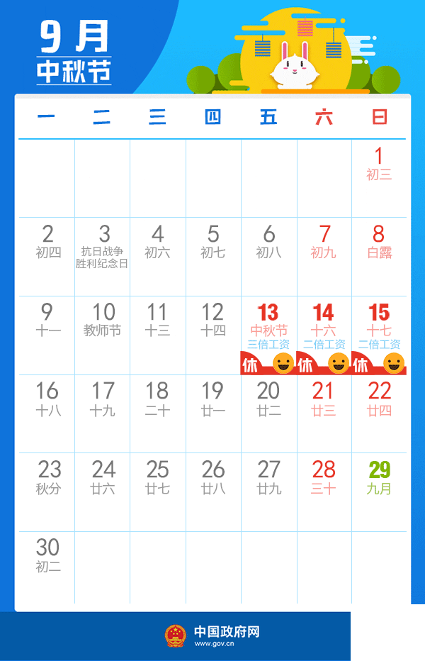六、中秋節:9月13日放假,與周末連休。