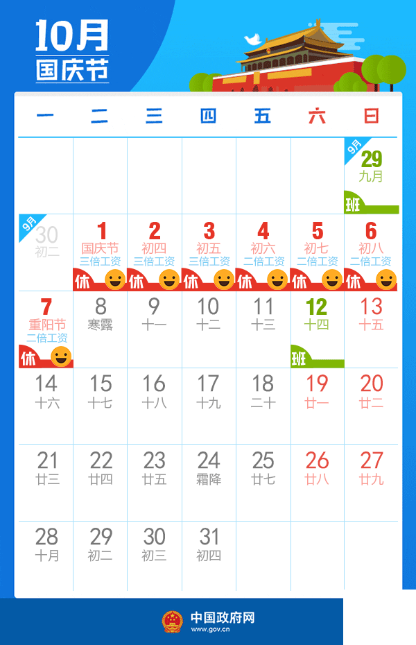 七、國慶節:10月1日至7日放假調休,共7天。9月29日(星期日)、10月12日(星期六)上班。