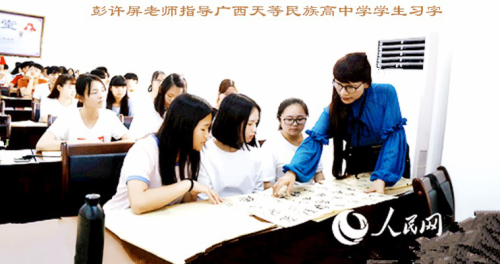 彭許屏熱心推動文化下鄉,2017年5月,到貧困地區廣西天等縣開展文化扶貧,向當地愛好書法的中小學生提筆授課、給學生、貧困戶、敬老院等贈字和慰問,通過文化扶貧傳播正能量,弘揚“扶貧先扶志”精神,傳播了自強不息、勤勞致富的正能量。