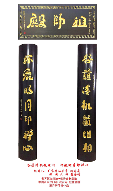 彭許屏應久負盛名法門寺和觀音寺慧慈法師(慧慈法師任觀音寺方丈)之力邀,以具有鮮明自身風格的漢字書法作品為法門宏光,可謂“天遂人愿、功德圓滿”。用彭許屏的話來說,也是“祖上積德”圓了自己久有的一場心愿。