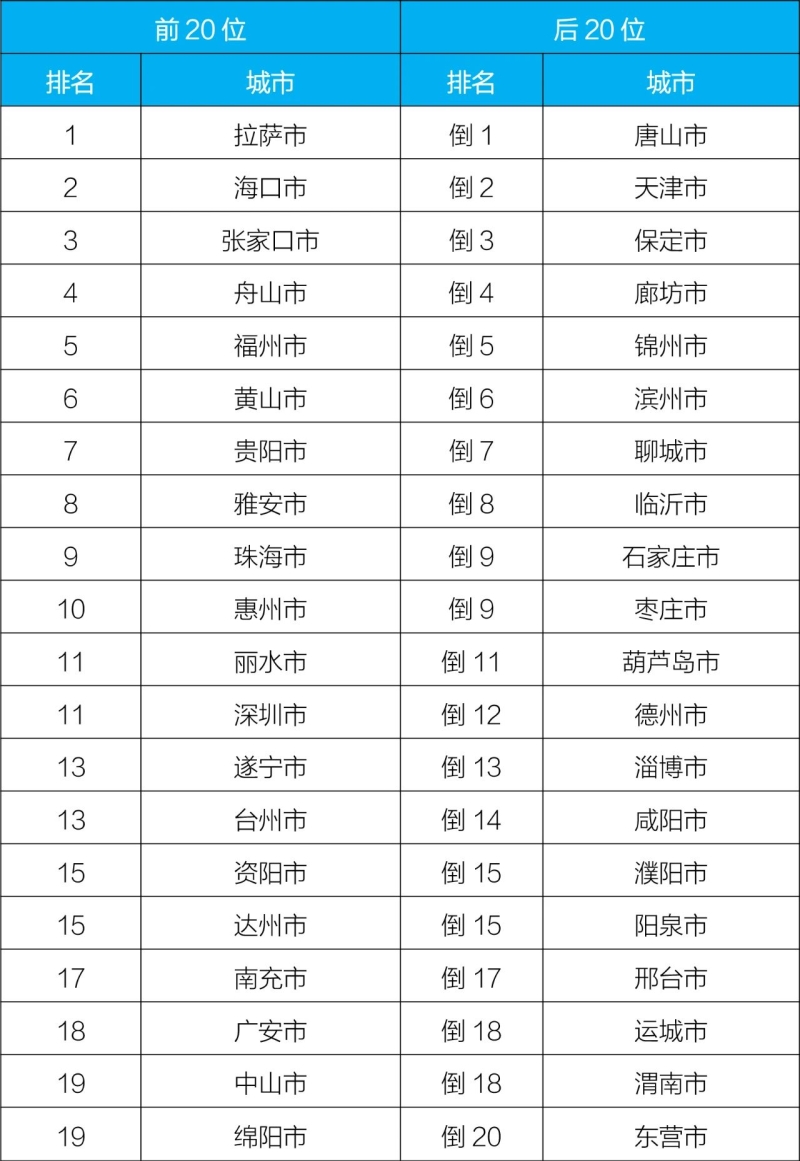 3月,168個重點城市中,拉薩、海口和張家口市等20個城市空氣質量相對較好(從第1名至并列第19名);唐山、天津和保定市等20個城市空氣質量相對較差(從倒數第1名至倒數第20名)。見附表1。
