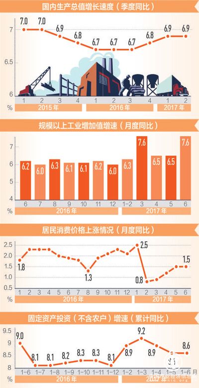 實際上,在國家統計局公布數據之前,國際機構就紛紛調高了2017年中國經濟增速預期。6月初,世界銀行發布的最新一期《全球經濟展望》表示,2017年中國經濟增速預期維持在6.5%不變,經濟再平衡不斷推進將增強中國未來經濟增長的可持續性;經合組織將中國2017年經濟增速預期上調0.1個百分點至6.6%;摩根士丹利也將今年中國GDP增速預期從此前的6.4%上調至6.6%。