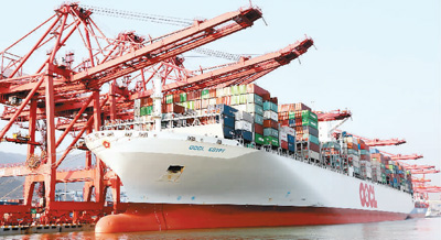 2018年10月12日,在江蘇連云港港外貿集裝箱碼頭,貨輪在裝卸進出口集裝箱。王春 攝(人民視覺)