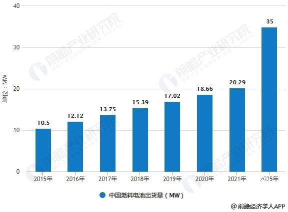 2015年中國燃料電池出貨量為10.5MW,同比增長14.1%,預計2018年中國燃料電池出貨量將為15.39MW。未來燃料電池市場將持續增長,預計2035年中國燃料電池出貨量將達到35MW。