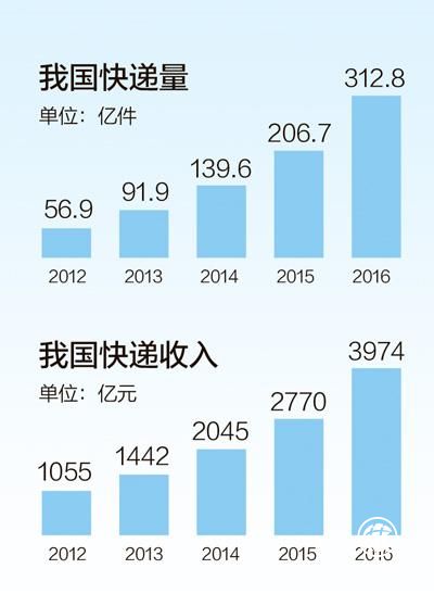 今年第二季度開始,我國常態化進入單日快遞億件時代!從2012年的不到57億件,到2016年的312.8億件,黨的十八大以來,我國快遞業務量連續5年保持了平均50%以上的增速,市場規模自2014年開始穩居世界第一。5年來,中國快遞“火”起來,成為經濟發展的一抹“亮色”。
