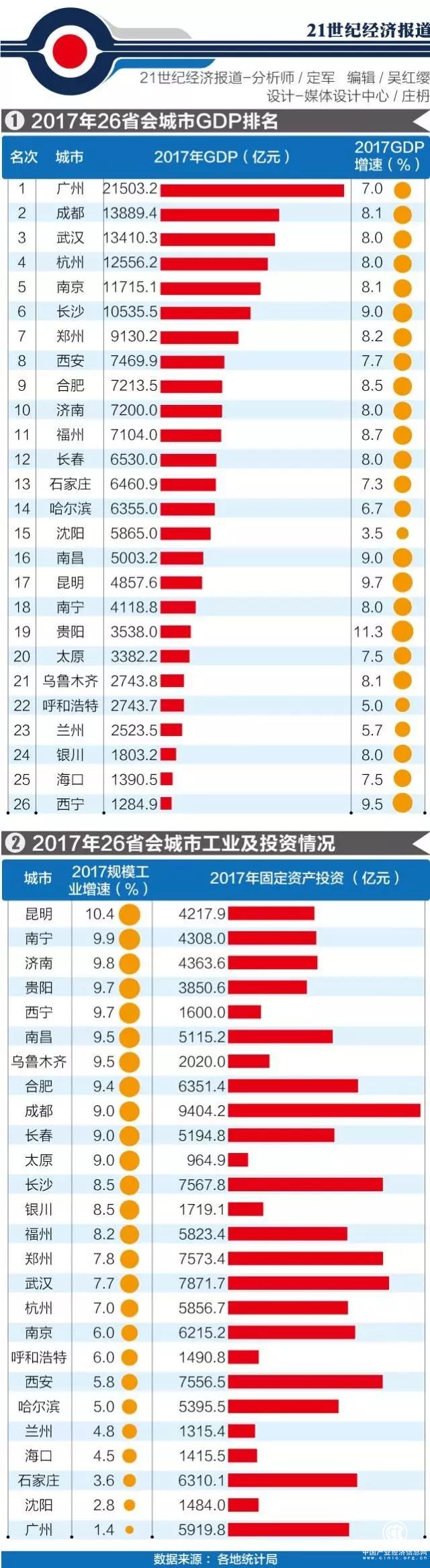 2017年全國26省會城市GDP(注:本文未納入拉薩)以及增速發生了較大變化,反映出區域經濟顯現新的格局。
