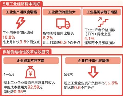 企業效益改善得益于供給側結構性改革成效持續顯現。一方面,企業成本不斷下降。1—5月份,規模以上工業企業每百元主營業務收入中的成本費用為92.59元,同比下降0.35元;其中,每百元主營業務收入中的成本為84.49元,同比下降0.31元;每百元主營業務收入中的費用為8.1元,同比減少0.04元。另一方面,企業杠桿率也在降低。5月末,規模以上工業企業資產負債率為56.6%,同比降低0.6個百分點。其中,國有控股企業資產負債率為59.5%,同比降低1.5個百分點,國有企業去杠桿成效更為顯著。